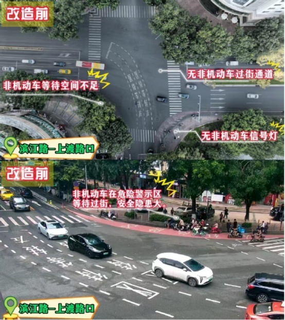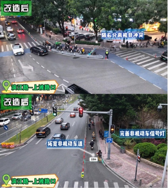 两个路口均增设非机动车专用信号灯、完善蓝色非机动车过街通道及等待区、完善隔离护栏,让市民骑行时有明确连续的非机动车通行时间路权和空间路权。